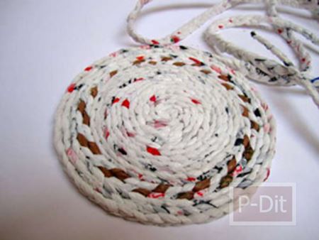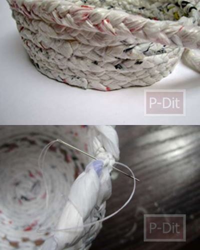 5.เมื่อได้ฐานแล้ว ก็ค่อยขดทับกันขึ้นมาเพื่อเป็นตัวถังขยะ (ความสูงตามต้องการ) แล้วใช้ด้ายเย็บให้แน่น
