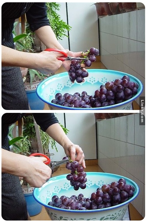2. ใช้กรรไกรตัดผลองุ่นออกจากพวงอย่างบรรจง ให้เหลือก้านไว้เล็กน้อยเพื่อไม่ให้องุ่นแตกออก ห้ามใช้มือเด็ดองุ่นเด็ดขาด เพราะจะทำให้เปลือกองุ่นขาดง่าย องุ่นที่จะใช้ทำไวน์ต้องอยู่ในสภาพที่สมบูรณ์ มีเปลือหุ้ม น้ำองุ่นต้องไม่ซึมออกมา