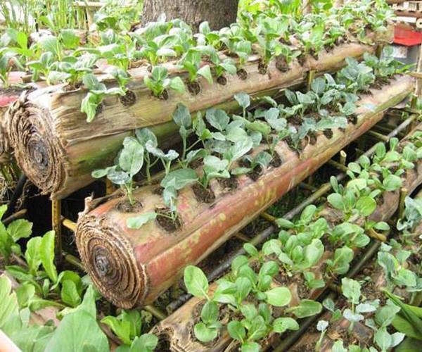 ผักที่นำมาปลูก ได้แก่ ผักสลัด ผักบุ้ง ผักกาดขาว หรือผักอะไรก็ได้ที่ ใช้เวลา ประมาณ 30 – 40 วัน ถ้าเกินนี้ต้นกล้วยจะโทรมและเหี่ยวแห้งตายเสียก่อน
