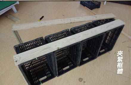 จากนั้นมัดลังพลาสติกให้ติดกันด้วยลวด แล้วตัดไม้ท่อนให้ได้ความยาวตามขนาดของลังพลาสติก