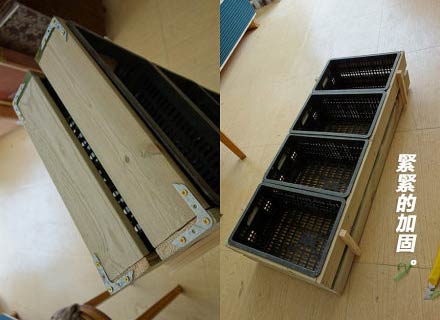 ประกอบไม้เป็นวงสี่เหลี่ยมครอบลังพลาสติกไว้ โดยทำวงไม้ 2 ชั้นตามตัวอย่างในรูป